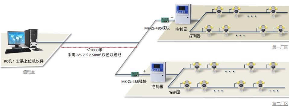 气体报警控制器与气体探测器之间采用m-bus两总线通讯,控制器与总监视平台之间采用RS485通讯。控制器为非防爆产品安装在值班室或监控室,气体探测器为防爆型产品,防爆等级为Exd IIC T6 Gb可安装在危险场所的1区2区,总监视平台应建立在总控室或值班室。|